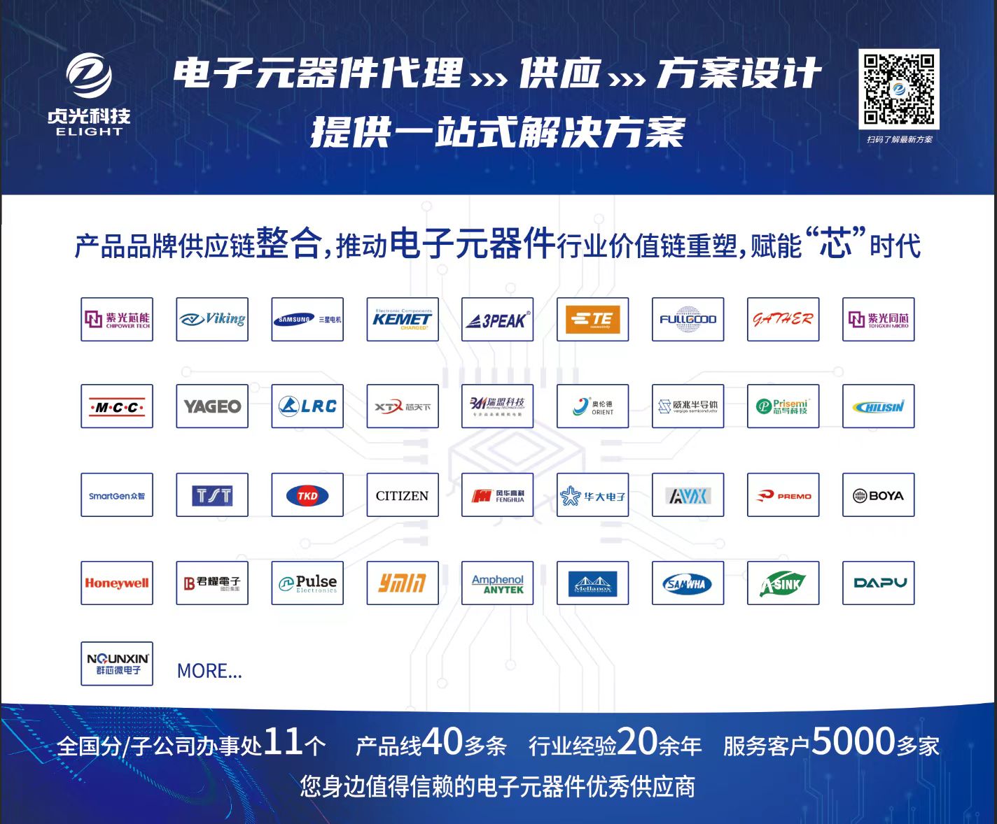 The Company is a leading distributor of electronic components,the authorized brands included Samsung,Kemet,Viking,Chilisin,MCC,TE,3PEAK, LRC,CHIPPOWER etc