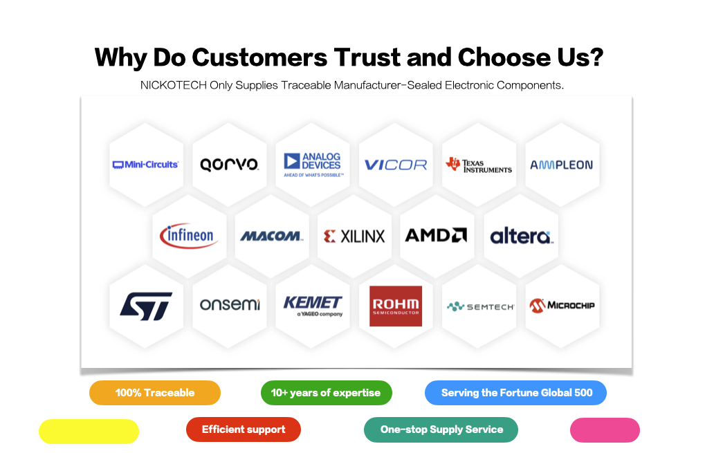 Компания NICKOTECH  поставляет только те электронные компоненты, отследить которые можно с печатью производителя электронные компоненты. Сотрудничают с всемирно известными производителями электроники для создания широкого ассортимента продукции, TWO ONE (HK) LIMITED специализируется на области радиочастот и помогает клиентам эффективно решать задачи, связанные с радиочастотными технологиями.